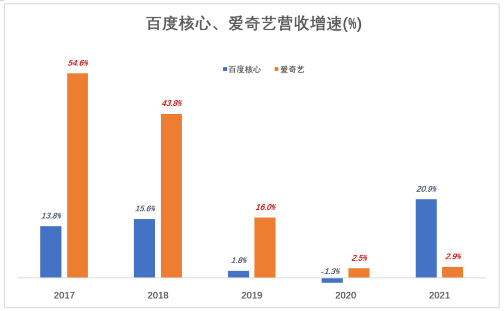 2021年,百度核心增速回升到20.9%,愛(ài)奇藝增速2.9%,百度集團(tuán)營(yíng)收增長(zhǎng)16.3%。