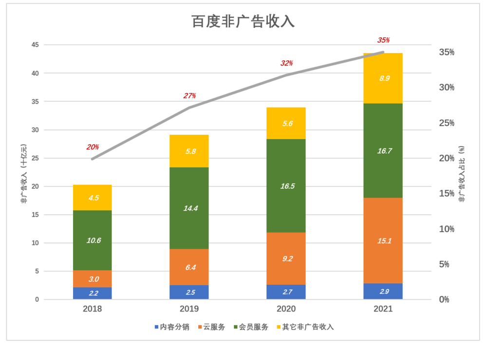 2021年,會(huì)員服務(wù)、內(nèi)容分銷(xiāo)、智能云及其它非廣告收入占百度營(yíng)收的35%。