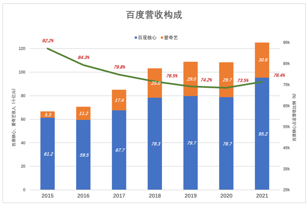 2021年,百度核心收入為952億,占總營(yíng)收的比例反彈到76.4%。