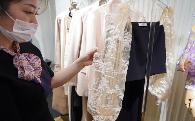 “這款改良版旗袍,有‘只此青綠’主題圖案的加入,極具中國傳統文化特色,”孫小梅介紹說,這個設計來源于虎年春晚的舞蹈詩劇《只此青綠》,很受年輕顧客的喜歡。而,國潮設計師品牌密扇的“綠色格陵紋牡丹刺繡款”、囍宴系列等在小紅書上很火的“國潮風”,在銀泰百貨專柜賣得很好。