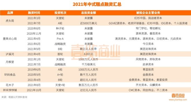 壹覽商業(yè)數(shù)據(jù)顯示,2021年中式糕點(diǎn)領(lǐng)域共發(fā)生10起融資,涉及6個(gè)品牌,披露融資金額超10億元,投資方不乏紅杉中國、IDG資本、美團(tuán)龍珠資本、今日資本、GGV等頂級機(jī)構(gòu)。