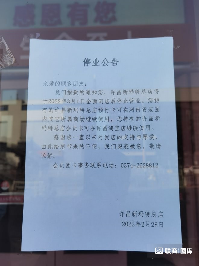 許昌大商新瑪特總店“停業(yè)公告”顯示,許昌新瑪特總店于2022年3月1日全面閉店后停止?fàn)I業(yè)。消費(fèi)者所持新瑪特總店預(yù)付卡可在河南省范圍內(nèi)其他所屬商場使用,所持會(huì)員卡可在許昌鴻寶店繼續(xù)使用。