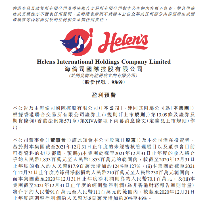 海倫司發(fā)布公告稱:預(yù)計(jì)2021年公司凈利潤虧損2.10億元-2.30億元;實(shí)現(xiàn)收入18.33億元-18.53億元,較2020年增加約124%至127%。