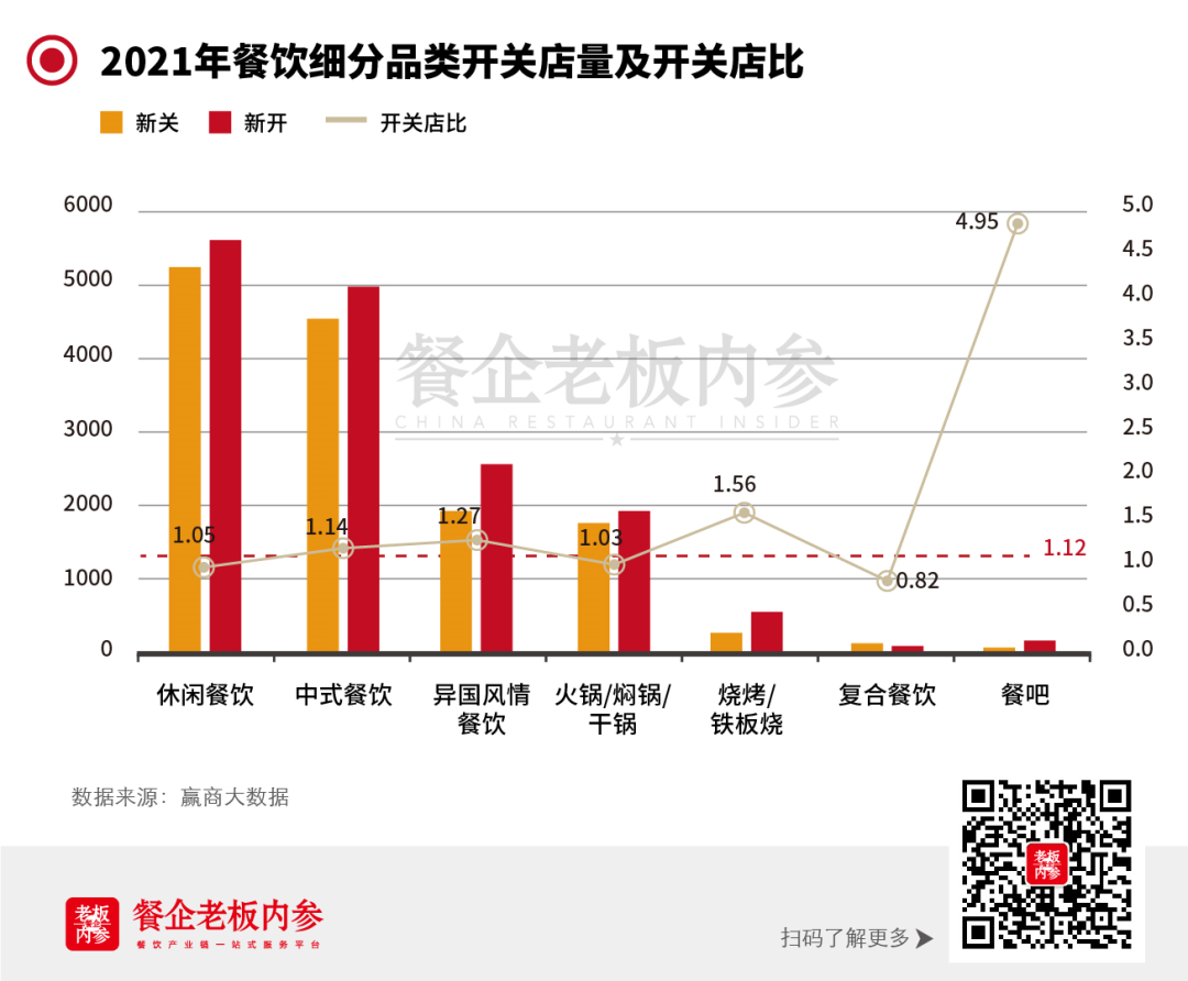 2020上半年,餐飲業(yè)遭遇疫情沉重打擊,整體開關(guān)店比驟降至0.73。而到了2021年,餐飲業(yè)回溫,整體開關(guān)店比1.12,呈現(xiàn)小幅擴張,大多數(shù)細(xì)分品類比值均大于1。