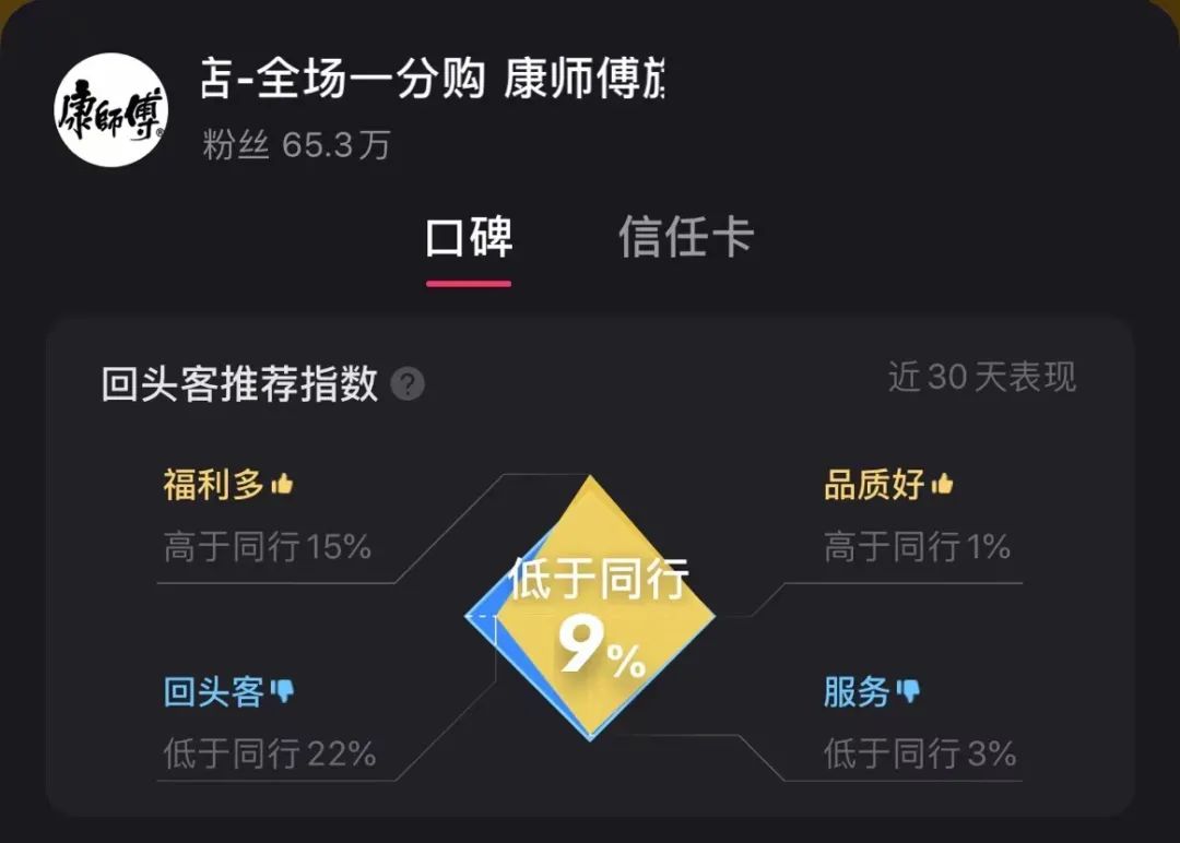 首先是一分購活動的質(zhì)量和效率,以康師傅直播間為例,雖然直播排名和直播數(shù)據(jù)均位于全網(wǎng)頭部,但直播間口碑卻低于同行9%,其中,回頭客更是低于同行22%;仡^客比例不高,快手借助一分購活動盤活整個快手電商的野望便無從說起。