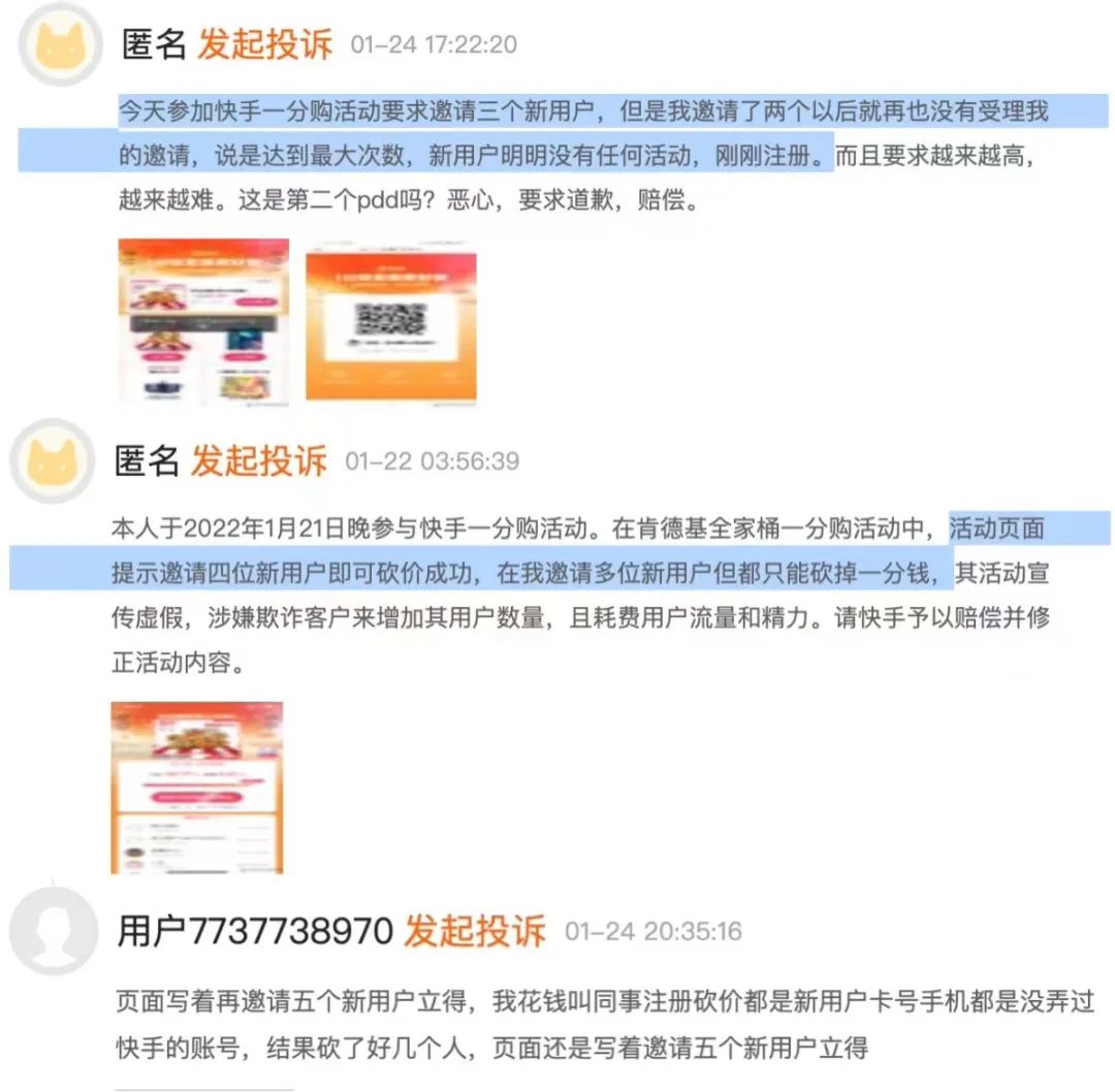 這一活動,無疑是拼多多砍一刀活動的翻版。但快手的這一活動卻遭遇了眾多差評和質(zhì)疑。黑貓投訴上,眾多消費者表示完成規(guī)定的拉新人數(shù),卻未獲得一分購資格。
