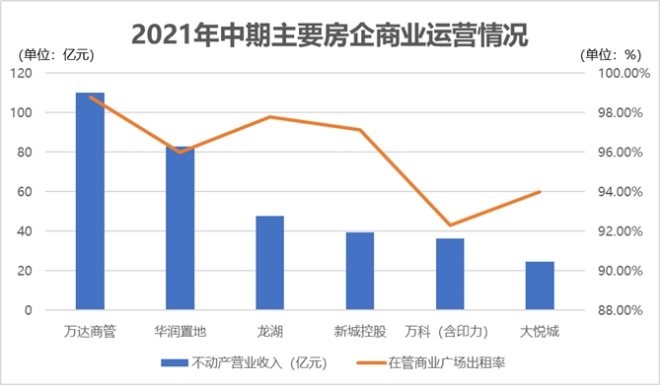 數(shù)據(jù)顯示,2021年上半年,華潤(rùn)置地不動(dòng)產(chǎn)業(yè)務(wù)營(yíng)業(yè)額達(dá)82.8億元,龍湖商業(yè)投資性物業(yè)租金收入47.8億元,新城旗下吾悅廣場(chǎng)租金收入則為36.7億元。