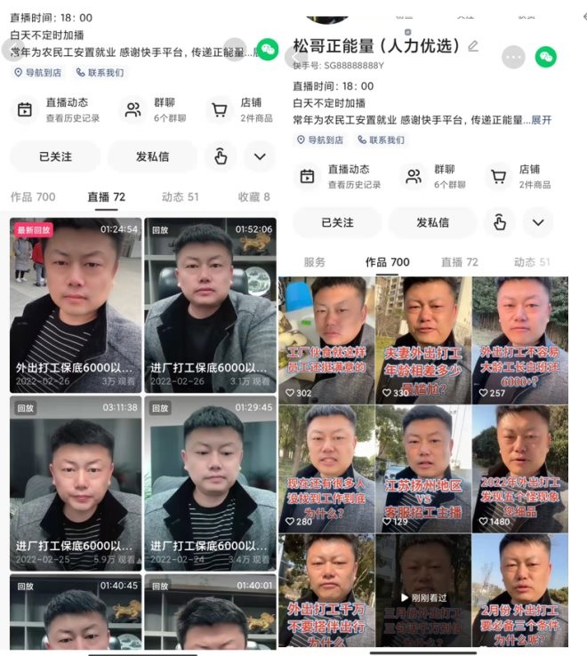 2018年,王林松就曾在快手上嘗試過(guò)直播招工!爱(dāng)時(shí)招了幾個(gè)人,但人沒(méi)怎么留下,轉(zhuǎn)化率很低,后來(lái)就不做了。招一個(gè)人,企業(yè)每月給10塊錢傭金,都不夠我一趟油錢”。在快手上專做直播招聘的頭部賬號(hào)“松哥正能量”主播王林松告訴雪豹財(cái)經(jīng)社。