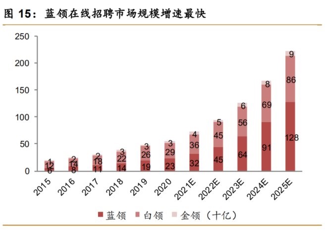 BOSS直聘招股書顯示,中國(guó)藍(lán)領(lǐng)群體2020年至2025年應(yīng)聘過(guò)程的線上化率,有望從13%提升至29.9%,藍(lán)領(lǐng)在線招聘市場(chǎng)規(guī)模或?qū)⒂?2.8億元提升至128.5億元。