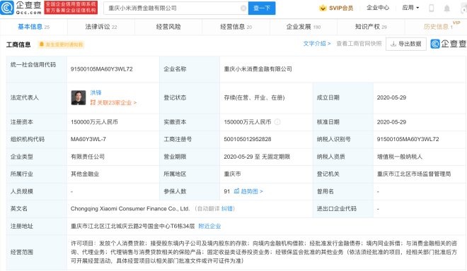 重慶小米消費(fèi)金融有限公司成立于2020年5月,法定代表人洪鋒,注冊(cè)資本15億,經(jīng)營(yíng)范圍含發(fā)放個(gè)人消費(fèi)貸款;接受股東境內(nèi)子公司及境內(nèi)股東的存款;向境內(nèi)金融機(jī)構(gòu)借款;與消費(fèi)金融相關(guān)的咨詢(xún)、代理業(yè)務(wù)等。