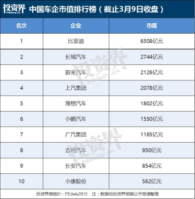從市值而言,新能源汽車已經(jīng)霸榜中國車企排行前列。截止3月9日收盤,位列國內車企市值第一的為新能源汽車巨頭比亞迪,市值高達6508億元;而蔚來則緊緊跟隨在長城汽車之后高居第三位,理想、小鵬分列第五、六位,超越了廣汽集團、吉利汽車等一眾傳統(tǒng)車企。