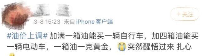 天平的另一端是,油價暴漲開始牽動了大家價格神經(jīng)。眼下國際原油持續(xù)飆漲,3月8日是10個工作日統(tǒng)計周期的第3個工作日,原油變化率24.01%,預計上調油價1040元/噸左右,已遠超上調紅線,折合升來看,約為0.78-0.94元/升的漲幅。