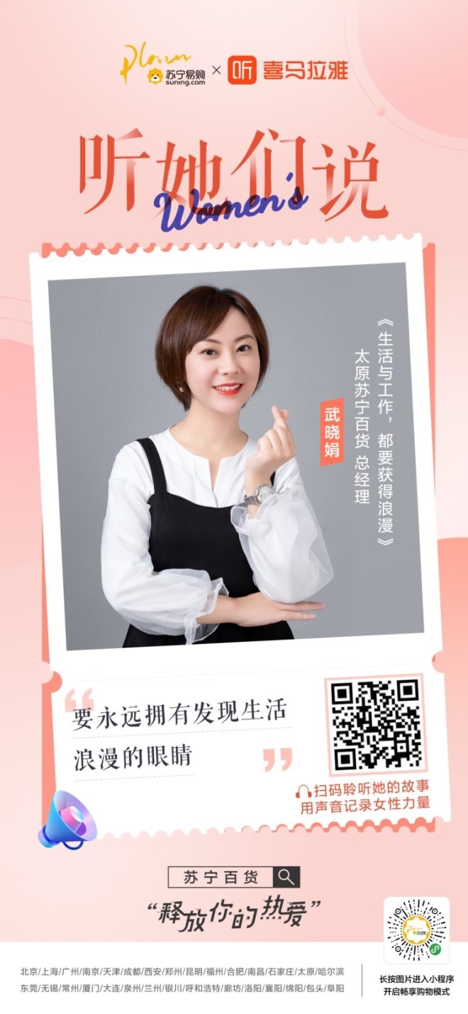 活動期間,蘇寧百貨同時邀請自有員工積極參與,以各個職業(yè)的女性為主要演講人員,以“女性的力量值得被看見”為主題,通過自述親身經(jīng)歷和征集家庭生活、個人成長等話題,用聲音的方式記錄女性力量,用聲音撫慰人心。