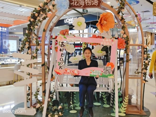 本次3.8檔期,蘇寧百貨聯(lián)合美顏相機(jī)APP,推出“春日LOOK”系列打卡活動,展現(xiàn)女子柔美能量。全國37家百貨結(jié)合美顏相機(jī)及“花!痹兀谱髁舜蚩ㄅ恼誅P位,推出聯(lián)合自拍活動。