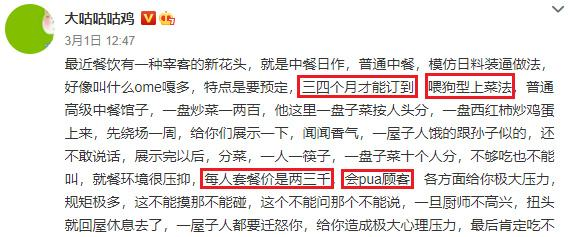 一是這事不常有,消費(fèi)人均2000+的館子算是見(jiàn)過(guò)大世面了;二是這件事夠離譜,套餐兩三千的中餐,你就賣我西紅柿炒雞蛋?這是把咱們的智商按在菜板上當(dāng)餃子餡剁。