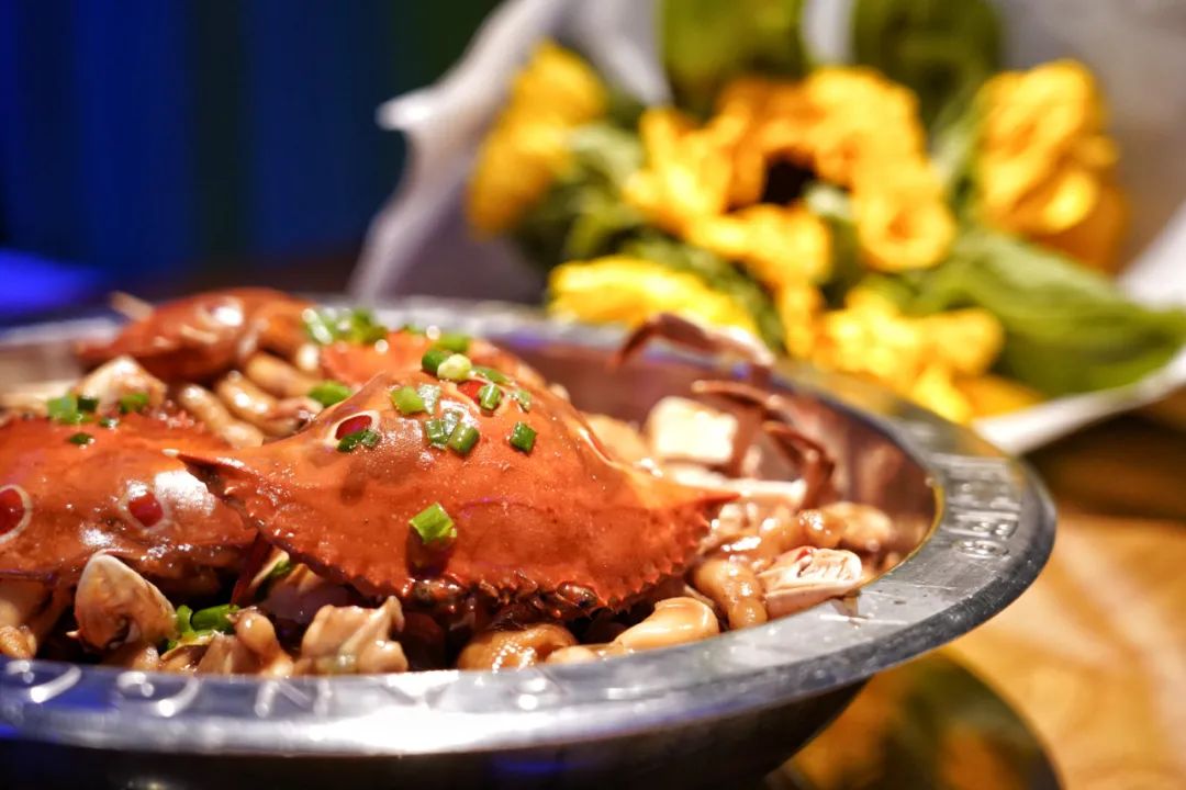 七欣天餐廳主打以螃蟹為首的海鮮類(lèi)產(chǎn)品,特色是“一鍋兩吃”,即將海鮮和火鍋這兩種截然不同吃法結(jié)合。先是上一道海鮮成品菜,吃完后加湯繼續(xù)火鍋。說(shuō)白了也就是最普遍的干鍋之后加湯涮菜。