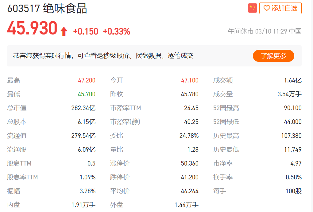 2017年3月,絕味食品登陸資本市場(chǎng)。雖然創(chuàng)立時(shí)間遠(yuǎn)晚于煌上煌(1993年)、久久丫(2002年)、周黑鴨(1997年),但這位后生卻“一騎絕塵”,2019年成為業(yè)內(nèi)首家破萬(wàn)家門店的企業(yè)。截止2022年3月10日午盤,絕味股價(jià)45.93元/股,總市值282.3億,相當(dāng)于2個(gè)周黑鴨(107.2億)和一個(gè)煌上煌(58.52億)。絕味食品也穩(wěn)坐中國(guó)鹵制行業(yè)市場(chǎng)的“頭把交椅”。