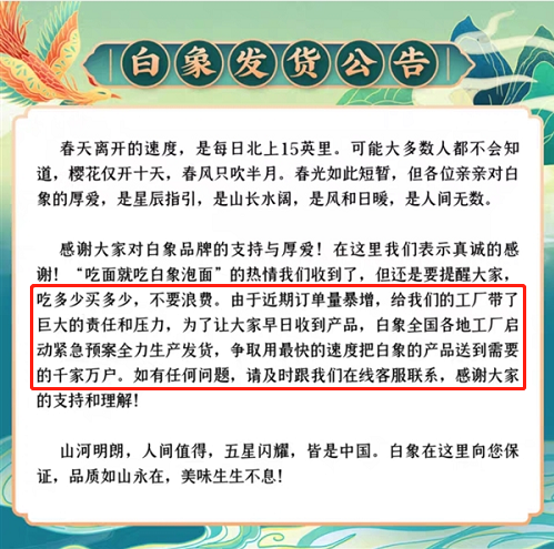 流量的激增,也直接體現(xiàn)在白象產(chǎn)品的銷量上。近日,天貓白象官方旗艦店貼出一則公告稱,因近期銷量暴增,白象全國各地工廠啟動緊急預(yù)案全力生產(chǎn),爭取用最快的速度將消費者下單的商品發(fā)出。