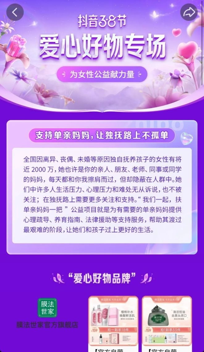 為幫助更多女性,抖音38節(jié)與深圳壹基金基金會的公益項(xiàng)目「我們一起,扶單親媽媽一把」進(jìn)行聯(lián)動,設(shè)置了“愛心好物”專場,并上線“愛心好物品牌”榜及“人氣愛心好物”榜。消費(fèi)者每購買一次帶有“愛心好物”標(biāo)識的商品,平臺商家便會向該公益項(xiàng)目進(jìn)行一定金額的捐贈,為獨(dú)撫母親提供支持和援助。