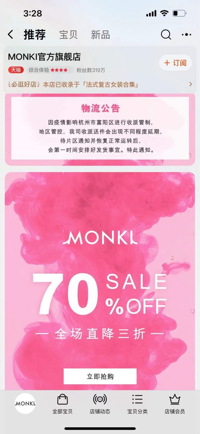聯(lián)商快訊:日前,快時(shí)尚品牌MONKI發(fā)布了閉店公告,宣布將于2022年4月1日起正式關(guān)閉其天貓旗艦店。3月10日至31日期間,Monki天貓店鋪全店3折清倉(cāng);4月1日起,全店商品下架,停止銷(xiāo)售;4月15日后,客服也將關(guān)停。