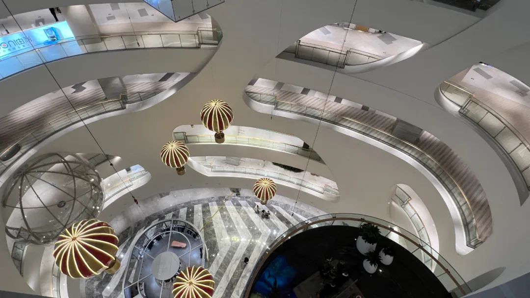 1.商場(chǎng)與湖景資源進(jìn)行融合,下沉式廣場(chǎng)到商場(chǎng)四層之間的小型水幕瀑布,打造出貼近自然的購物環(huán)境。中庭打造的懸挑28米高的無柱中庭,使內(nèi)裝視覺效果更加明亮、通透。