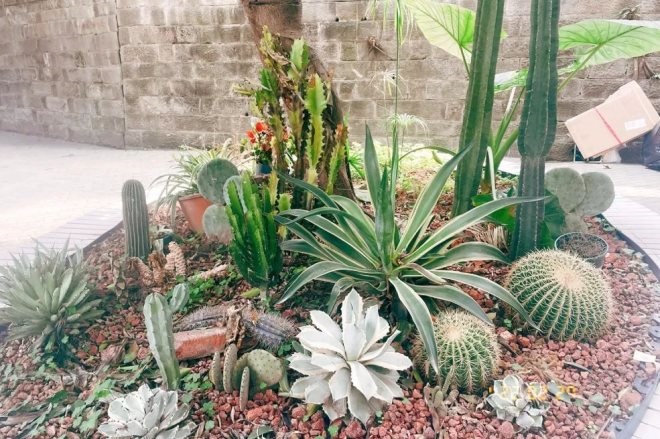 戶外露天區(qū)域有一處精心布置的綠植區(qū),里面種著仙人掌、虎尾蘭、金琥、藍(lán)石蓮、火殃勒等植物,表面再鋪上了厚厚一層松樹皮松鱗,這是駱雨薇最為滿意的區(qū)域,也是收獲眾多顧客好評(píng)的拍照取景處。