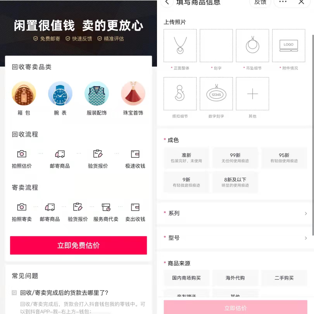 目前,抖音的“回收寄賣”服務(wù)為用戶提供兩種變現(xiàn)模式。一種是直接由平臺回收,用戶將商品拍照后,系統(tǒng)會進(jìn)行預(yù)估,然后用戶郵寄商品(免費(fèi)),再由平臺驗(yàn)貨報價,待用戶確認(rèn)后,平臺直接打款,完成交易。