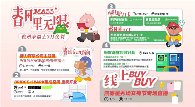 反映都市年輕人朝九晚五奔波工作,自嘲為“打工人”的內(nèi)卷現(xiàn)狀,杭州來(lái)福士中心以“春日Mall里無(wú)限”為主題,特別邀請(qǐng)到“POLYIMAGE能力有限公司”通過(guò)輕松有趣的方式,在每個(gè)忙碌加班、拖著勞累身體回家的深夜,給予堅(jiān)韌的“打工人”面對(duì)現(xiàn)實(shí)、迎難而上的勇氣,為自己提供無(wú)限可能。