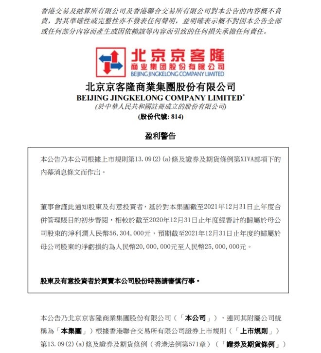公告顯示,北京京客隆預期2021年度的歸屬于母公司股東的凈虧損約為人民幣2000萬元至人民幣2500萬元。