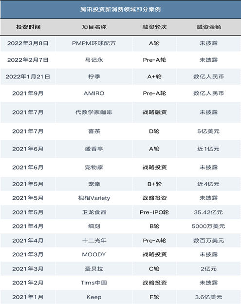 回過頭來看,在互聯(lián)網(wǎng)大廠中,騰訊在新消費(fèi)領(lǐng)域的投資比較廣,也比較深入深入。根據(jù)天眼查數(shù)據(jù)統(tǒng)計(jì),自2021年開始,騰訊在新消費(fèi)領(lǐng)域投資近20筆。