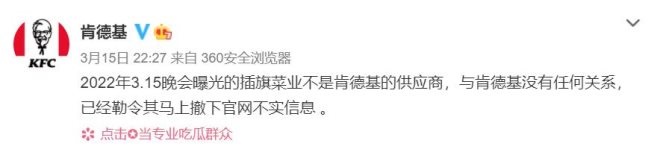 肯德基:插旗菜業(yè)不是肯德基的供應商,與肯德基沒有任何關(guān)系,已經(jīng)勒令其馬上撤下官網(wǎng)不實信息 。