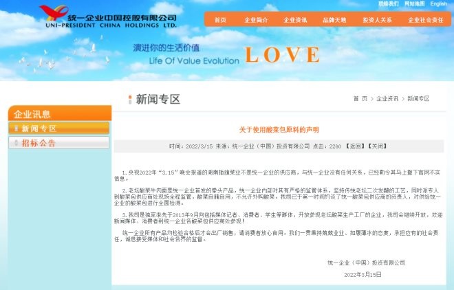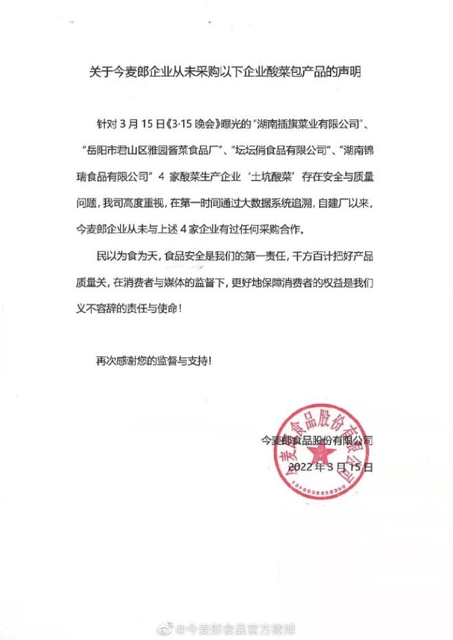 康師傅:插旗菜業(yè)是公司酸菜供應商之一,立即中止其供應商資格,取消一切合作,封存其酸菜包產(chǎn)品,配合監(jiān)管部門調(diào)查與檢測。