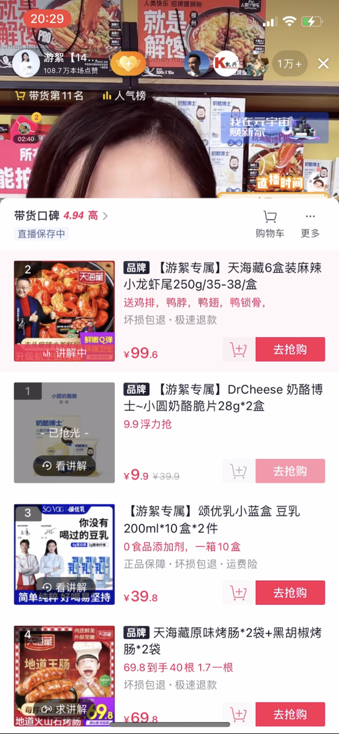 “這個蝦用的是超聲波清洗工藝,通過超聲波把蝦線洗掉,這個蝦洗得干干凈凈地在等你們。”“他們家的木耳之所以好吃,因為用紅油炒制的。”