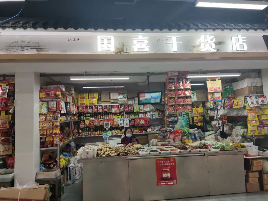 武漢市廣埠屯菜市場,往里走入內(nèi)靠近右手的一側(cè),一共有三家干雜店,每一家店里,左側(cè)擁擠又狹窄的貨架上擺放著各式各樣不知名的醬料,川香居的麻辣拌菜料、胡和記的麻辣面調(diào)料、壇壇鄉(xiāng)的豉香朝天椒……