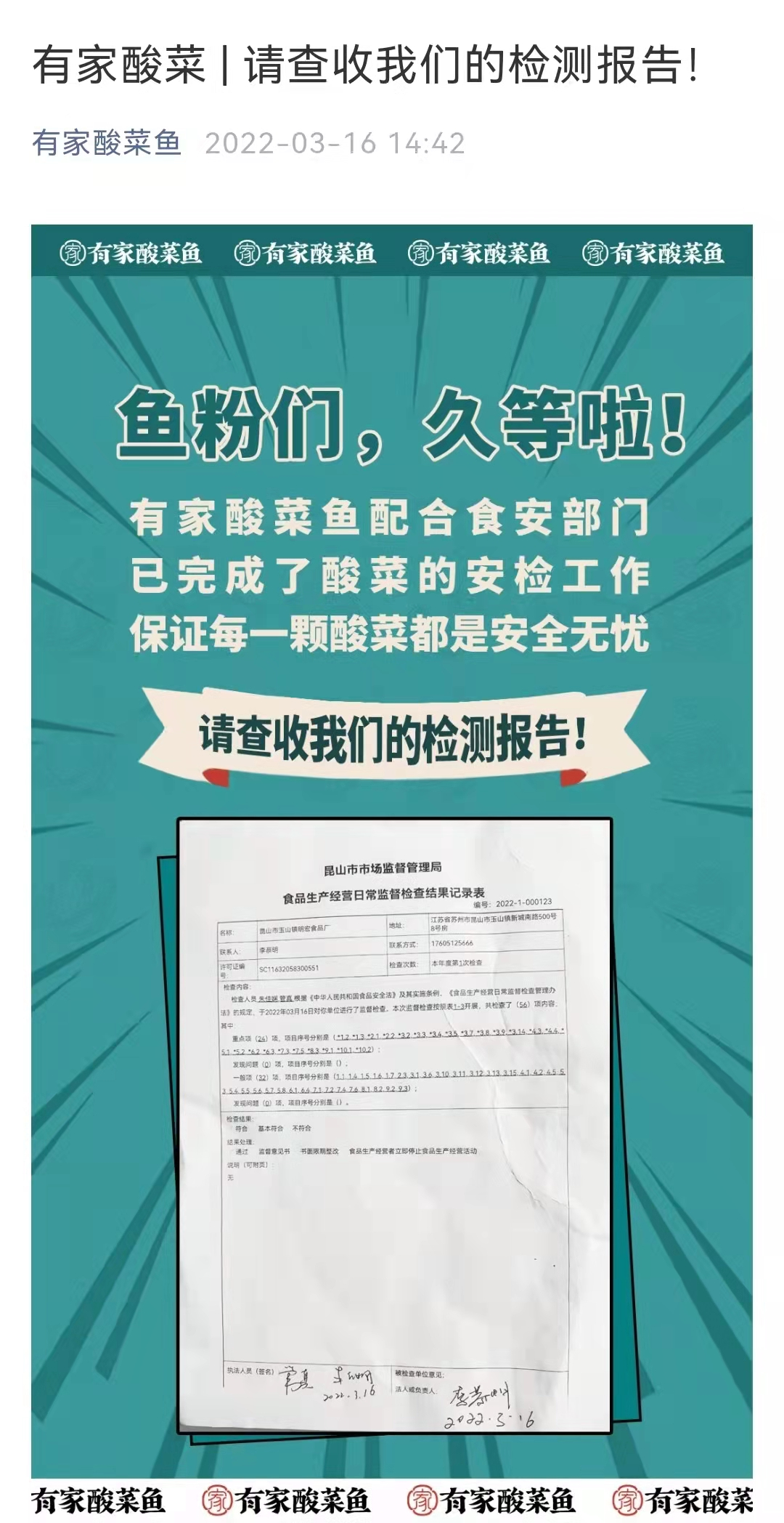 事情發(fā)生過后,有家酸菜魚第一時間配合市監(jiān)局對自家工廠的檢查,后出具了一份檢測報告。