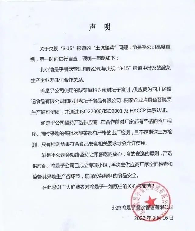 3月16日,渝是乎也在第一時間發(fā)出了聲明,表示“與央視3·15”報道中涉及的酸菜生產(chǎn)企業(yè)無任何合作關(guān)系”。