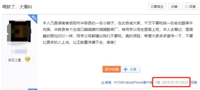 2015年,還有網(wǎng)友在百度貼吧中勸誡大家千萬不要吃統(tǒng)一的老壇酸菜牛肉面,該帖子在昨日315晚會(huì)后被眾多網(wǎng)友攻占,樓主也被稱為“預(yù)言家”。“華容縣有個(gè)插旗村插旗酸菜廠,有同學(xué)父母在里面上班,同學(xué)父母都建議我們不要吃,真的很臟。”
