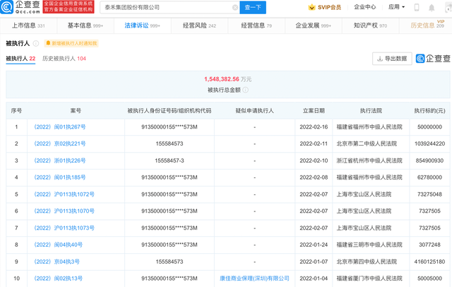 企查查風(fēng)險(xiǎn)信息顯示,泰禾集團(tuán)目前共有被執(zhí)行人信息22項(xiàng)、失信信息13項(xiàng)、限制高消費(fèi)信息26項(xiàng),其當(dāng)前被執(zhí)行總金額為154.84億。