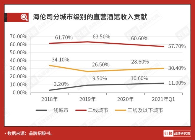 與酒館賽道整體發(fā)展相類似,海倫司在下沉市場(chǎng)的表現(xiàn)也堪稱優(yōu)秀。截至2021年9月24日,海倫司在一線城市有74家酒館,在二線城市有329家酒館,在三線及以下城市則有180家酒館。其中,二線城市直營酒館貢獻(xiàn)的營收最多,約占同期直營酒館總收入的60%,三線及以下城市次之,約占30%,一線城市則逐漸上升至10%左右。
