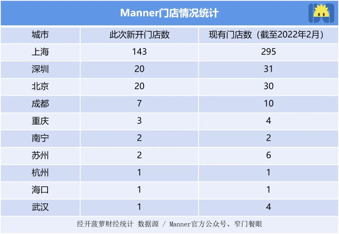 而且,數(shù)量聽(tīng)起來(lái)嚇人,但實(shí)際上Manner只是在上海很瘋狂,在外地偏保守。根據(jù)Manner官方公眾號(hào)的數(shù)據(jù),200家新店中的3/4依然開(kāi)在大本營(yíng)上海,深圳、北京分別開(kāi)20家,其余7城承包剩下的17家。