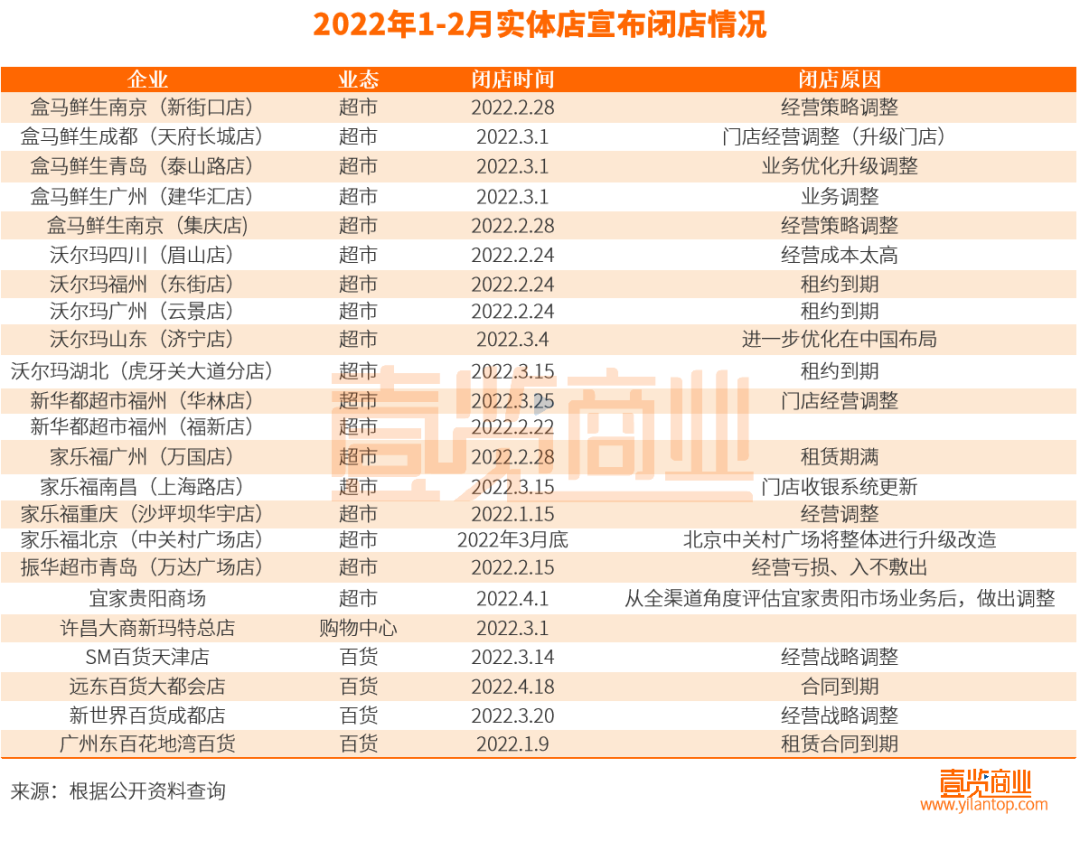 據(jù)壹覽商業(yè)不完全統(tǒng)計,1-2月國內(nèi)有23家門店宣布閉店,其中不乏SM百貨、家樂福、盒馬鮮生等知名品牌。