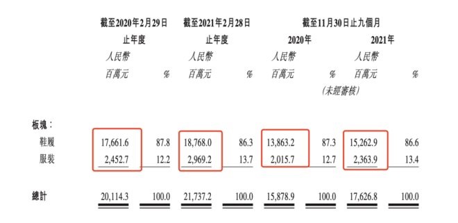 三是前百麗的經(jīng)營業(yè)績尚未恢復(fù)至其巔峰期的水平,但在逐年增長。2019/2020財年、2020/2021財年,百麗時尚鞋履業(yè)務(wù)收入分別為177億元、188億元,增長率為6.3%。截至2021年11月30日止九個月,公司鞋履業(yè)務(wù)實現(xiàn)營收153億元,較2020年同期增長10.1%。