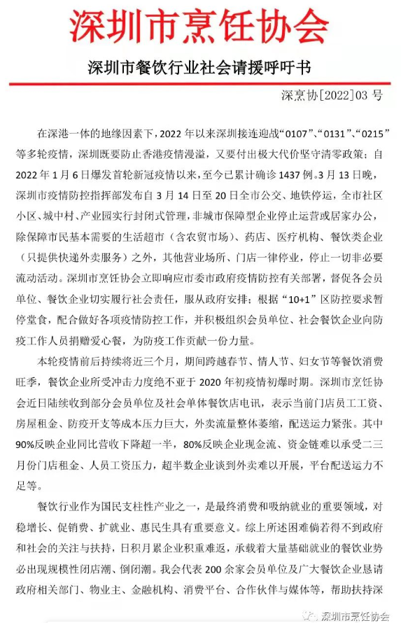 與至暗相伴的,同樣也有曙光。昨日深圳烹飪協(xié)會(huì)發(fā)布的《深圳市餐飲行業(yè)社會(huì)請(qǐng)?jiān)粲鯐?shū)》得到了深圳餐飲人大力點(diǎn)贊,呼吁書(shū)就目前深圳餐飲業(yè)難點(diǎn)情況做出闡述,并呼吁和懇請(qǐng)全社會(huì)幫助深圳餐飲早日回歸人間煙火氣。
