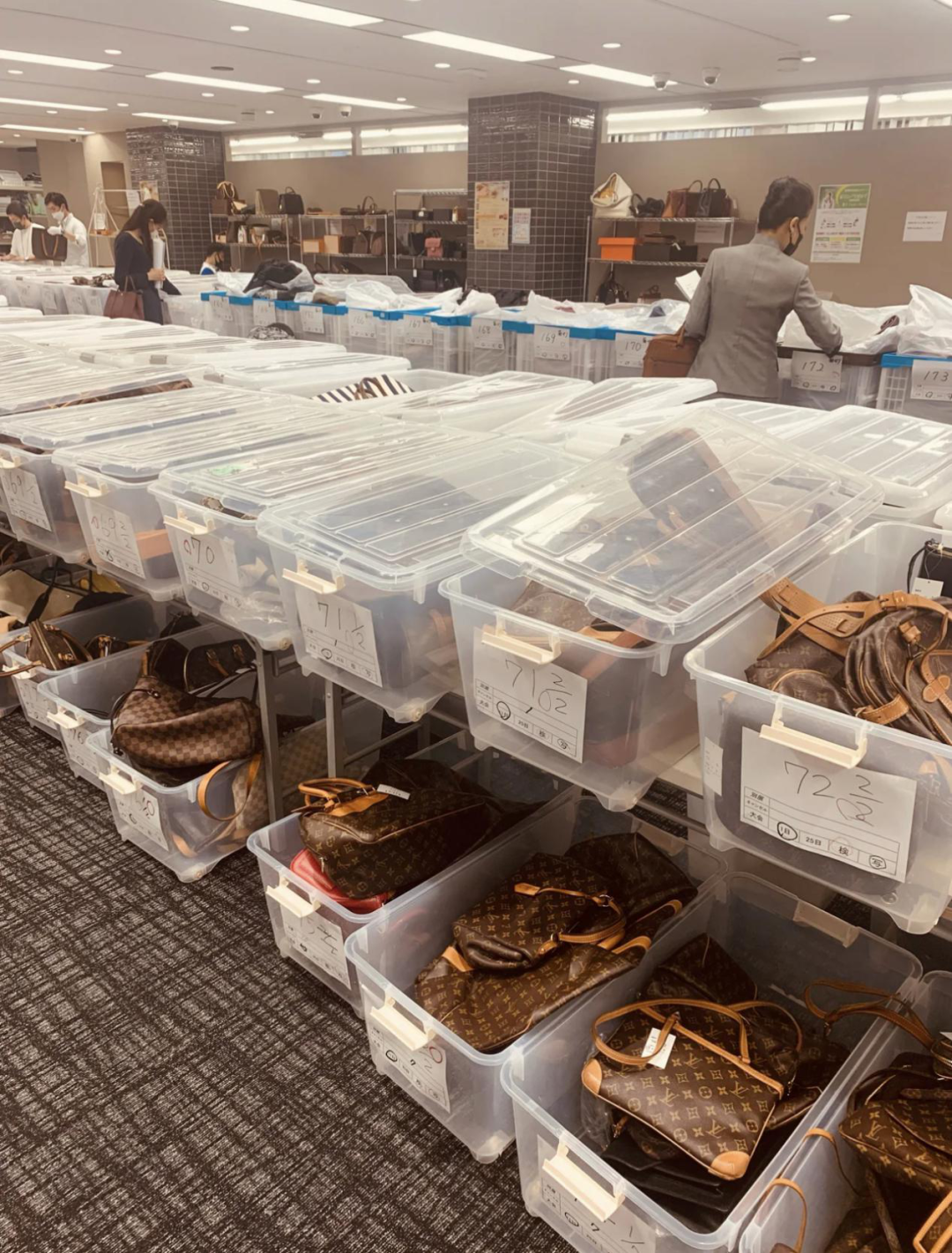 小紅書上,拍賣會(huì)上的視頻片段,拼湊出一場(chǎng)價(jià)格博弈的全貌:在拍賣現(xiàn)場(chǎng),各個(gè)品牌的二手包分別裝在半透明塑料箱里。箱子緊挨著擺放在兩排架子上,那壯觀的場(chǎng)景讓人不禁覺得交易對(duì)象是蔬菜水果而不是奢侈品。