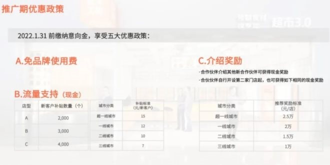 同時,“舌尖英雄”對加盟商進行補貼:發(fā)展一個新客戶,且購買超過15元,總部就會提供7~15元不等的補貼。城市級別不同、補貼不同,比如一線城市的補貼是15元,加盟商拉新2000人,就可以拿到3萬元補貼。
