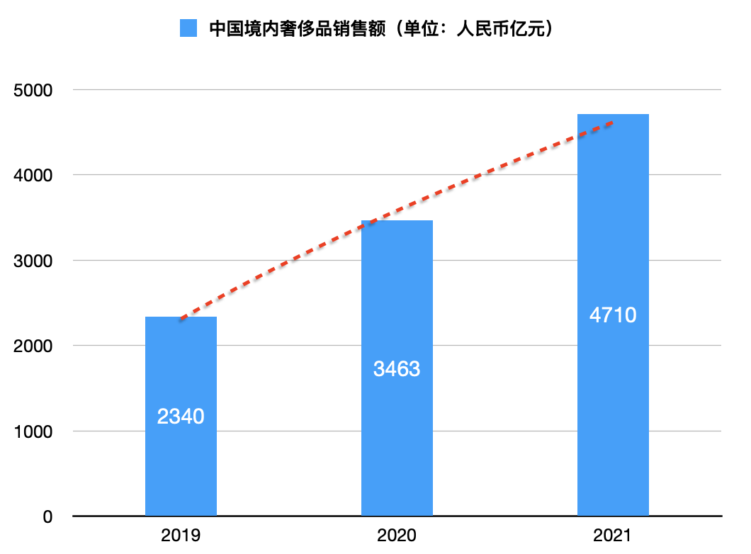 根據(jù)貝恩咨詢(xún)的報(bào)告。2019年中國(guó)境內(nèi)奢侈品消費(fèi)為2340億元,2020年則達(dá)到了3463億元,上漲47.9%,2021年更是達(dá)到了4710億元,較2020年繼續(xù)上漲36%。(見(jiàn)圖1)