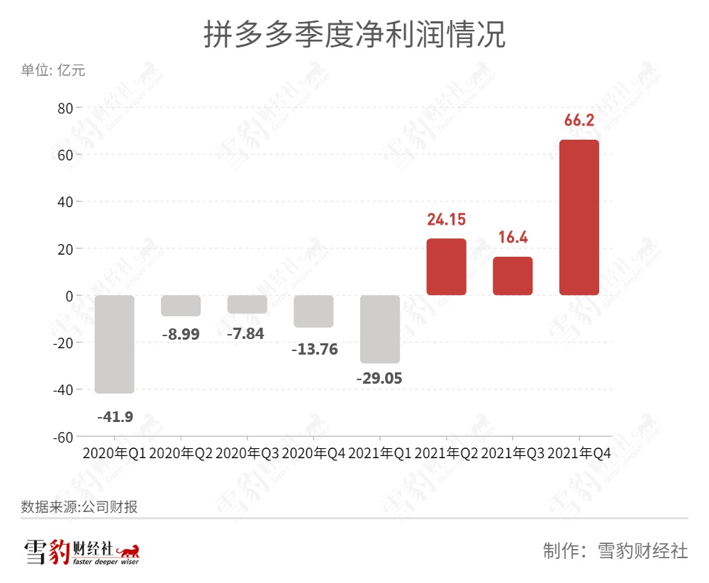 據(jù)財(cái)報(bào),拼多多2021年Q4營(yíng)收272.31億元人民幣,同比增長(zhǎng)3%;凈利潤(rùn)66.2億元,上年同期凈虧損13.76億元。2021年全年,營(yíng)收939.5億,同比增長(zhǎng)58%;凈利潤(rùn)77.69億元,上年度虧損71.8億元。2021年全年總成交額(GMV)達(dá)到24410億,同比增長(zhǎng)46%。