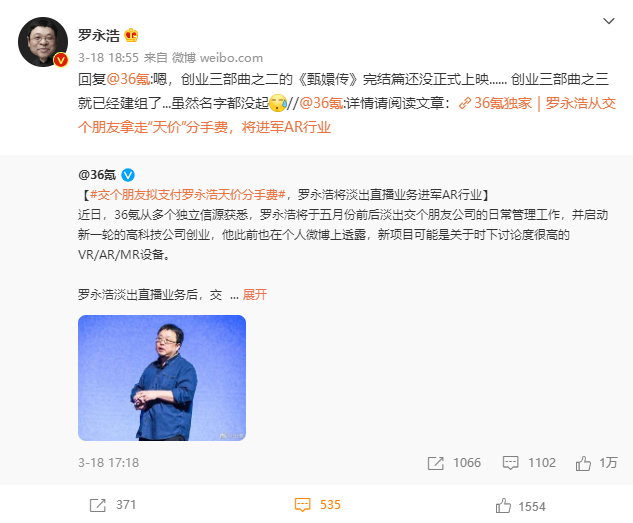 就目前來看,這個(gè)版本的說法得到了羅永浩本人的認(rèn)可。其還回復(fù)稱:“創(chuàng)業(yè)三部曲之二的《甄嬛傳》完結(jié)篇還沒正式上映……創(chuàng)業(yè)三部曲之三就已經(jīng)建組了…雖然名字都沒起!