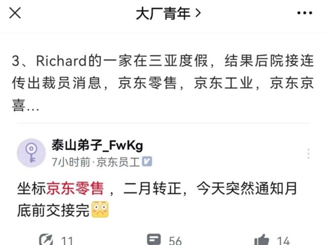 在零售V事業(yè)群拆散消息曝出之前,脈脈等各平臺有多名員工爆料,京東3月份開始的一波人員優(yōu)化同樣也波及到了零售業(yè)務。
