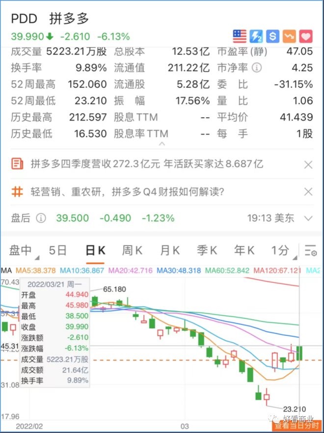 3月21日美股盤前,拼多多股價一度漲超8%;隨即拼多多以44.94美元高開,盤中最高漲至45.98美元,最低觸及38.5美元;最終它以39.99美元收盤,跌幅6.13%,換手率近10%。